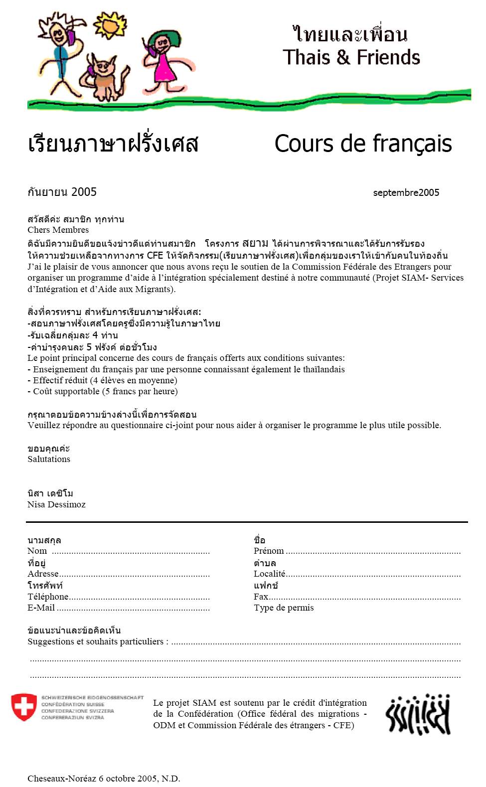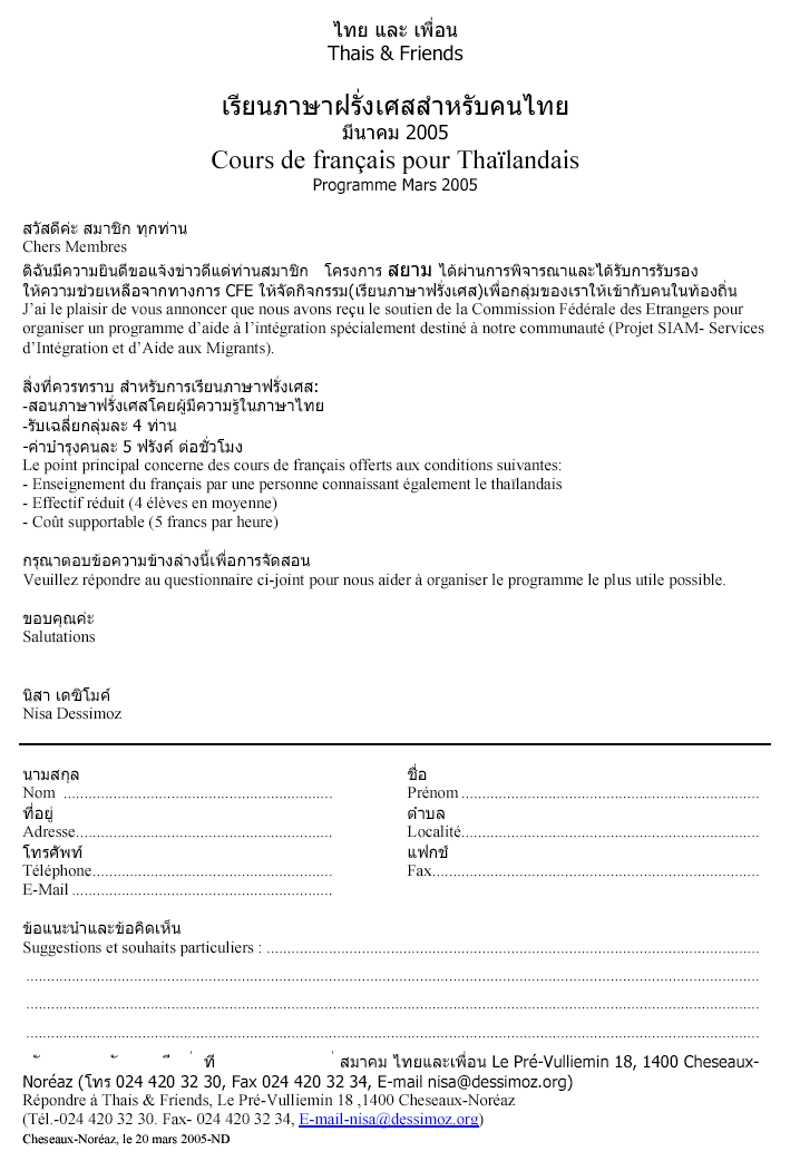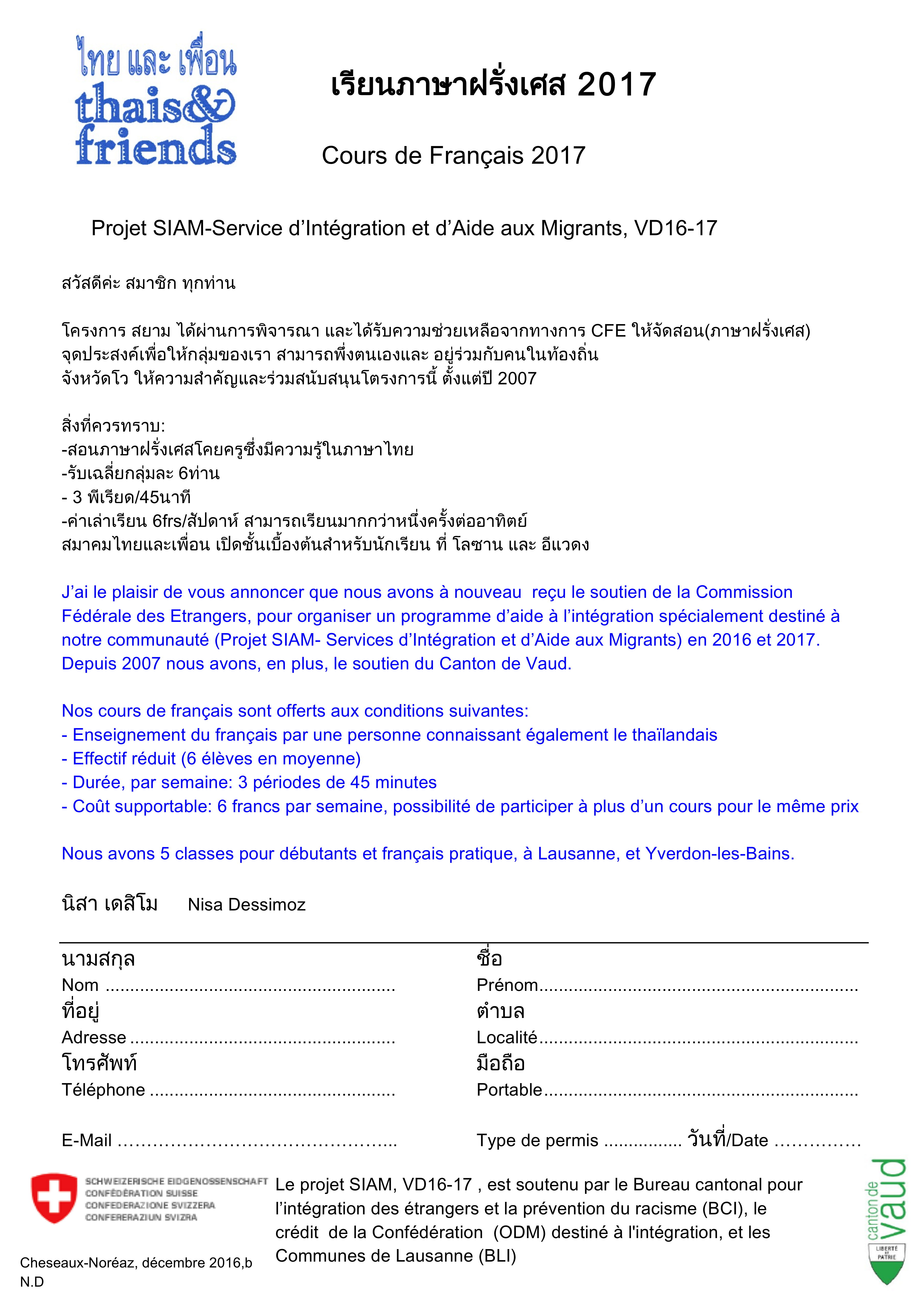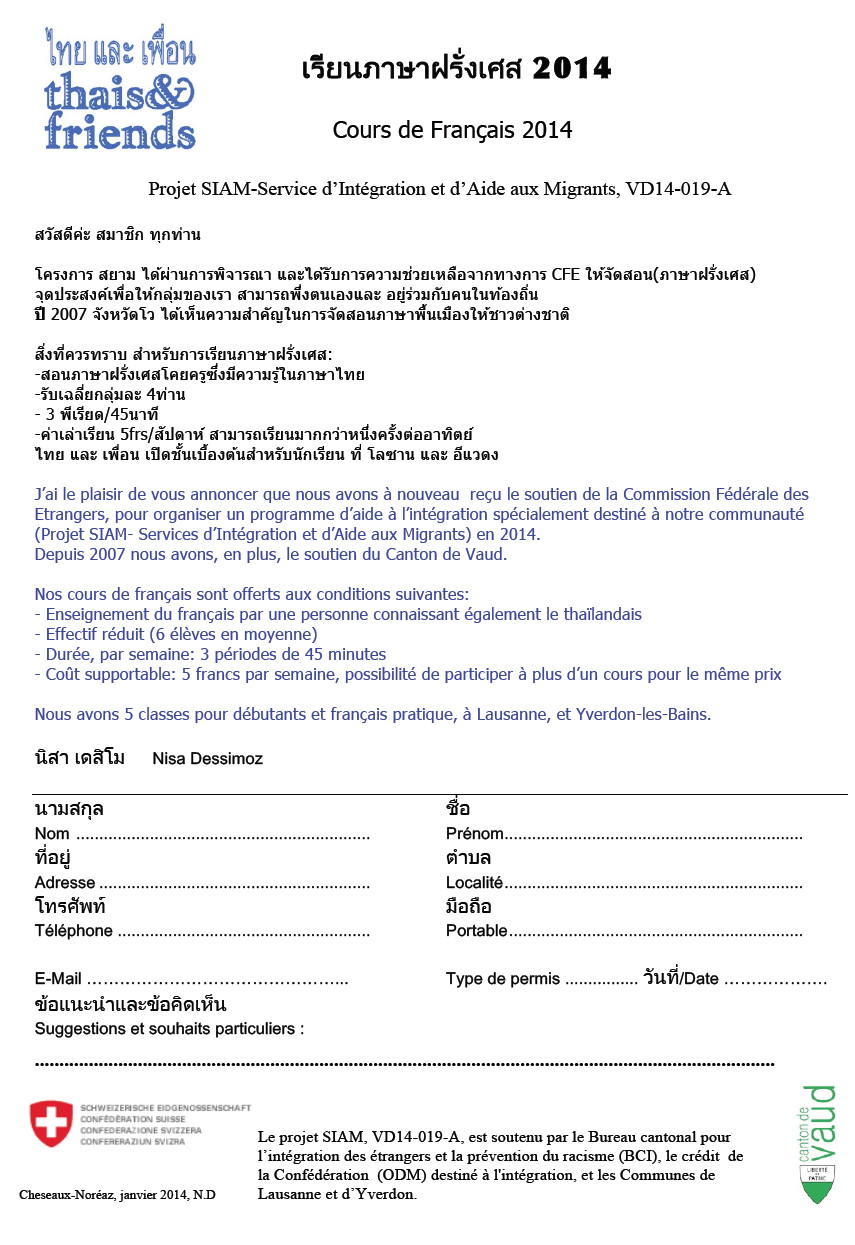 Annonce des cours de français et fiche d'inscription