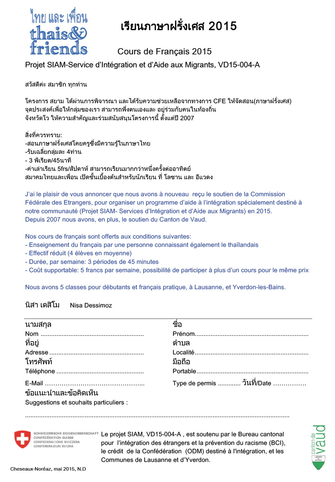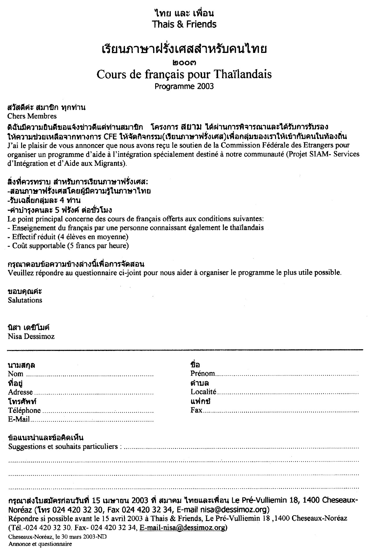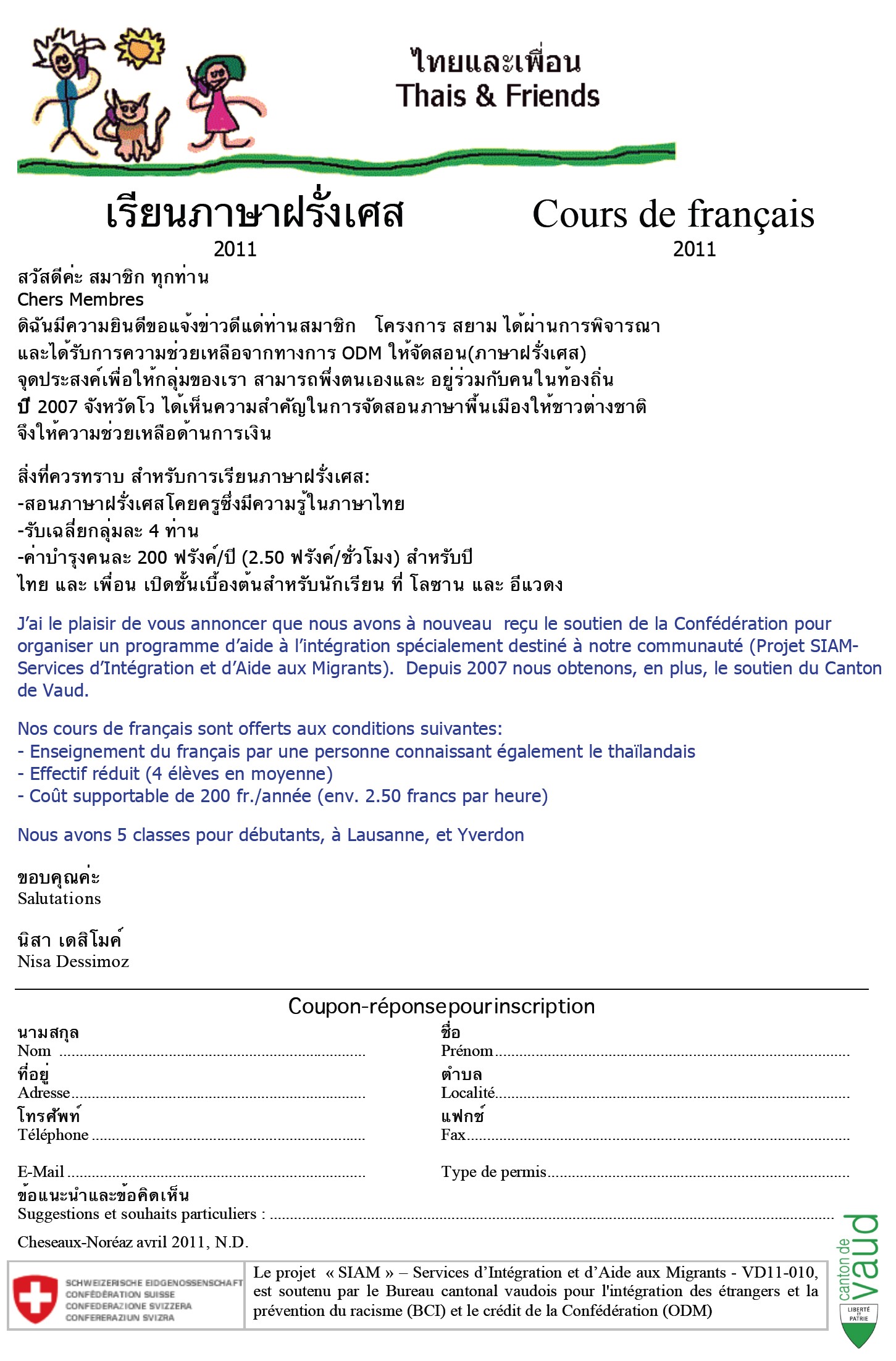 Annonce des cours de français et fiche d'inscription